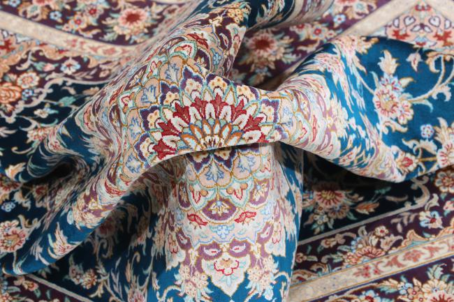 Silk rugs are soft, shiny rugs made from silk threads. They feel smooth, look bright, and often have fine patterns. They make any room look special and add a touch of luxury.