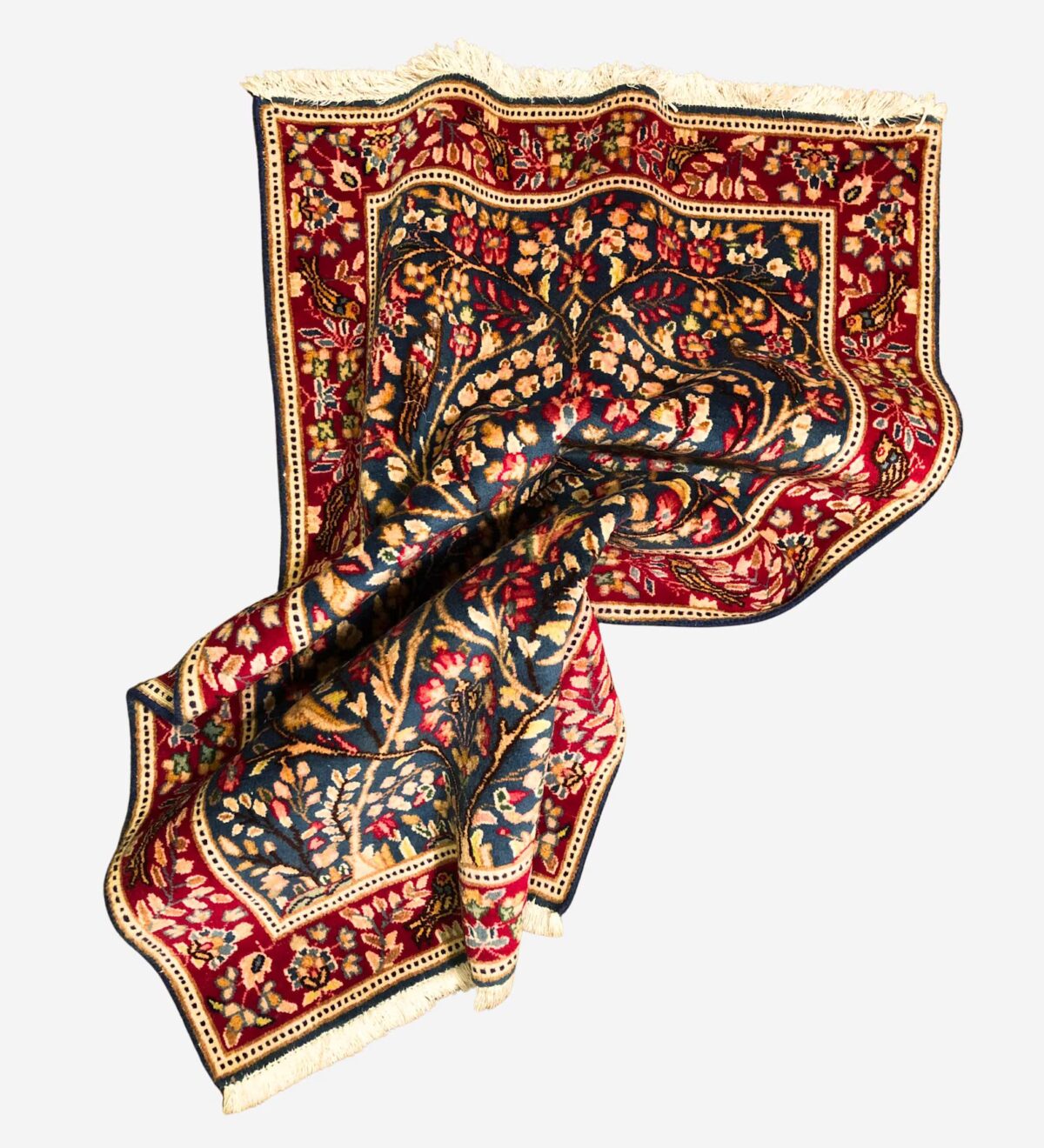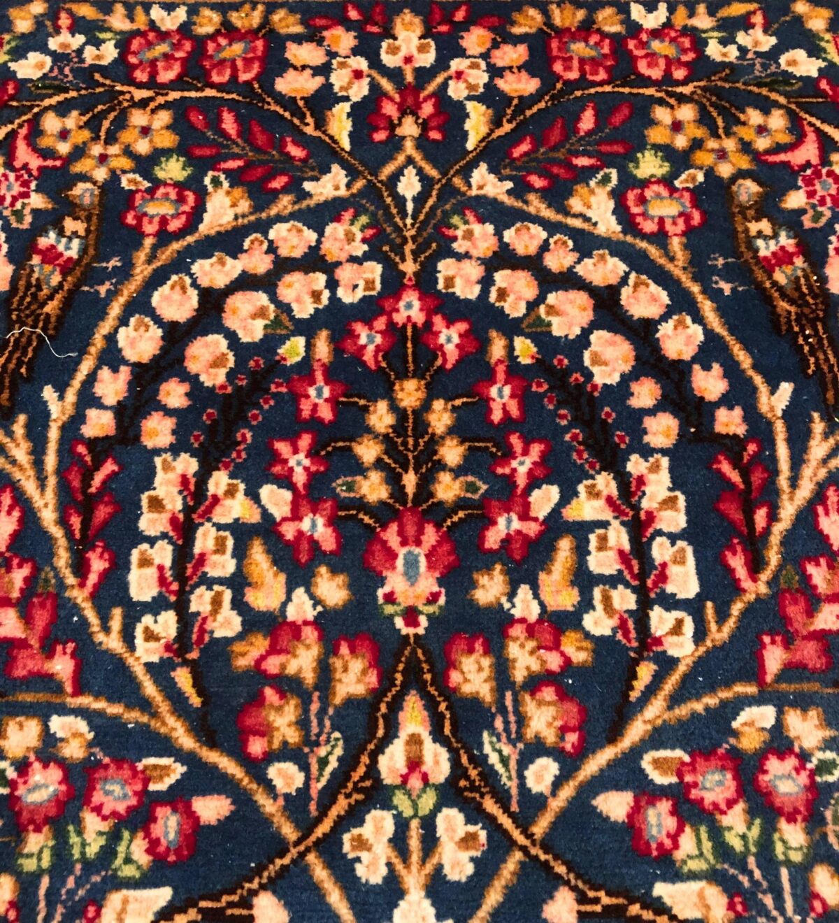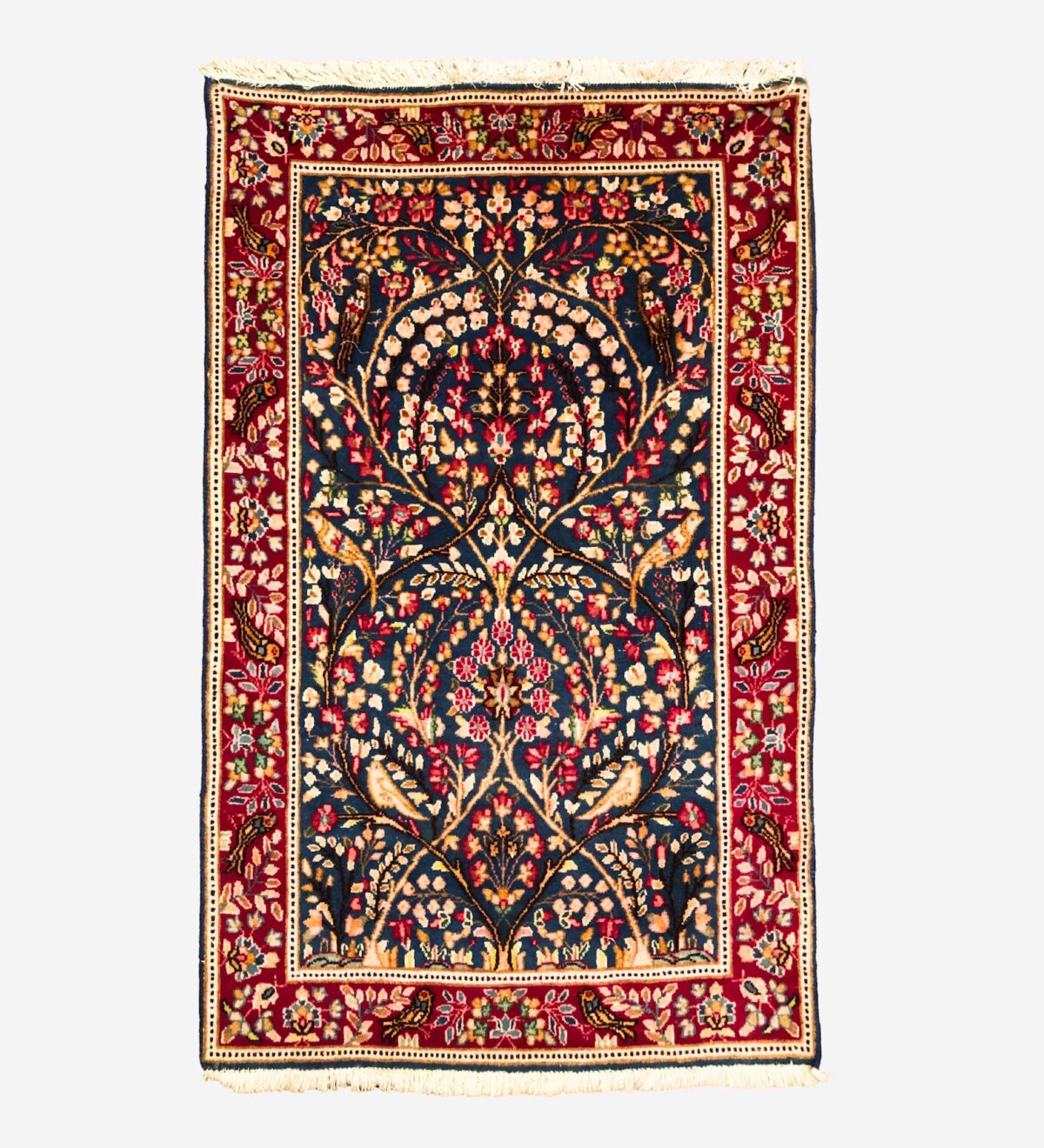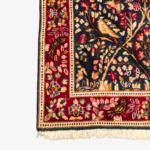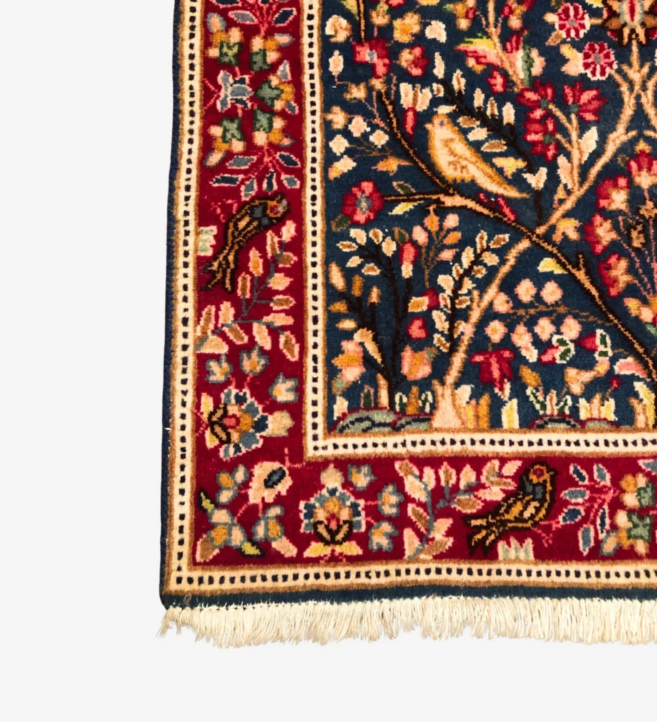 The Lavar Persian Kerman Rug is a handmade piece with fine knots and a lot of small, careful details. It shows soft natural colors, mostly blue, with flowers and a few birds worked into the design.