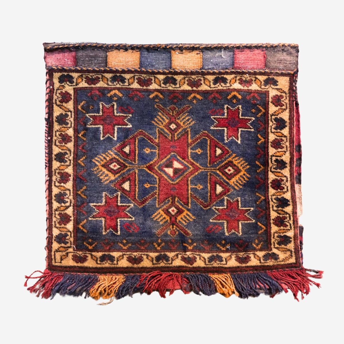A small handmade tribal rug bag with a knotted wool front and a kilim back. Woven in traditional style, it has a rustic, ethnic look and carries the charm of vintage craft.