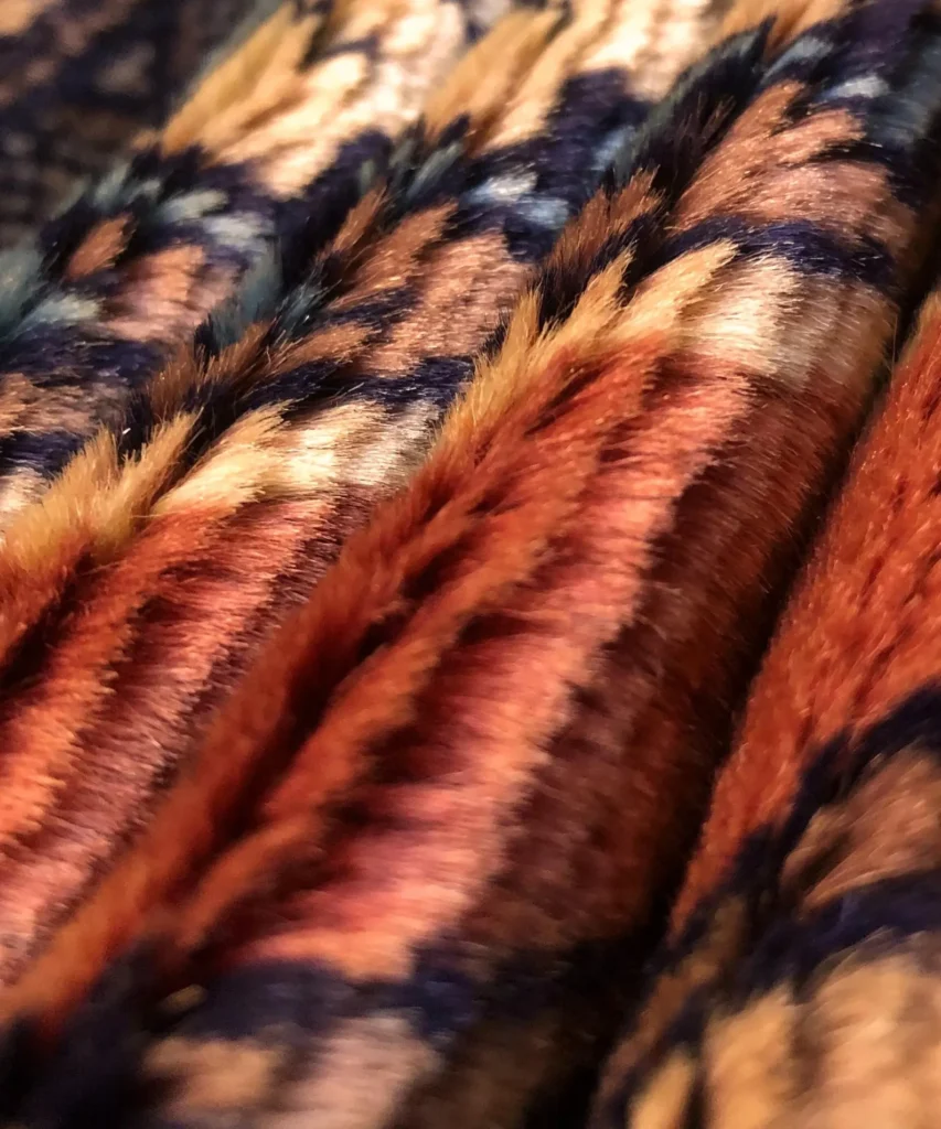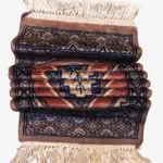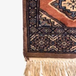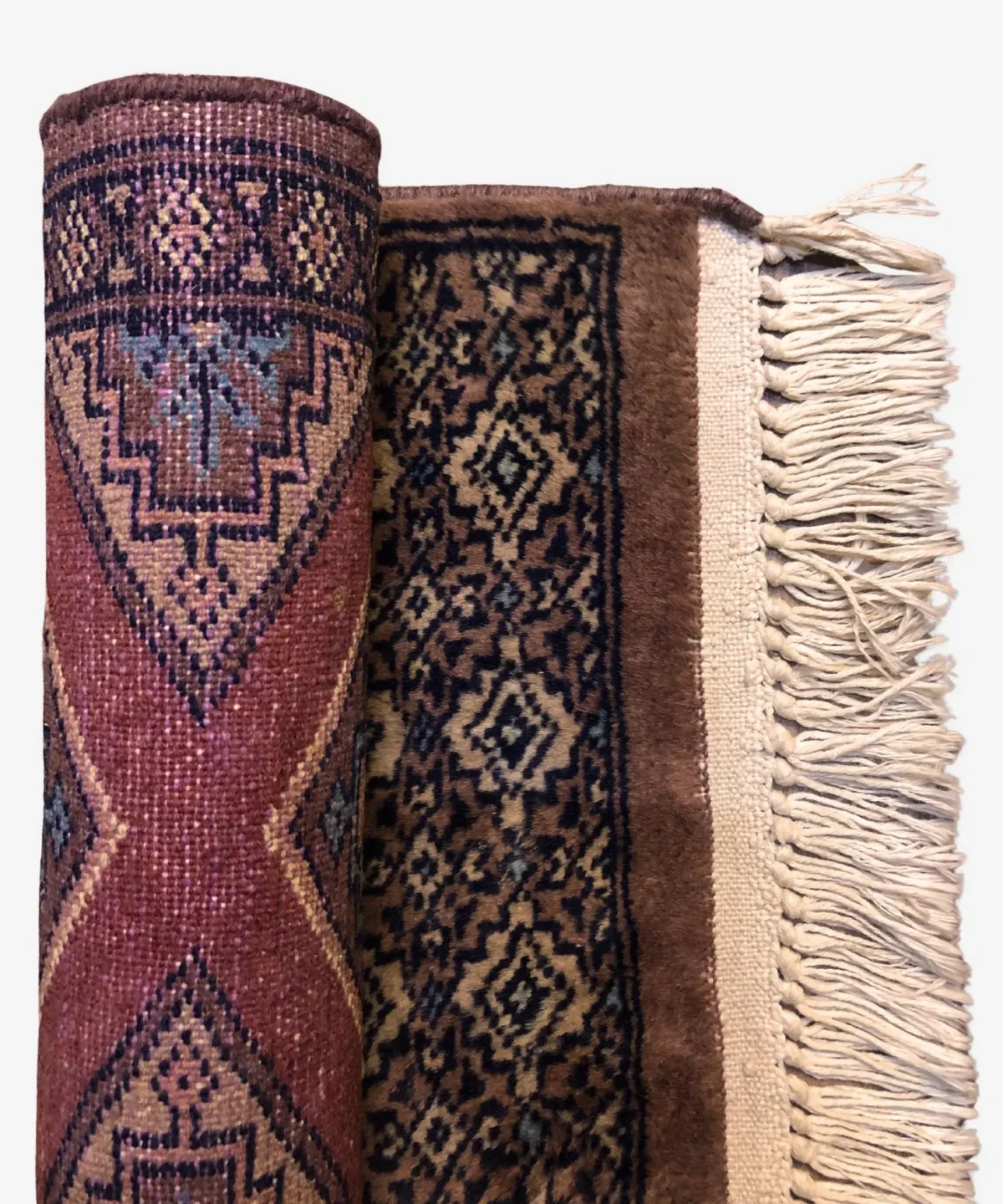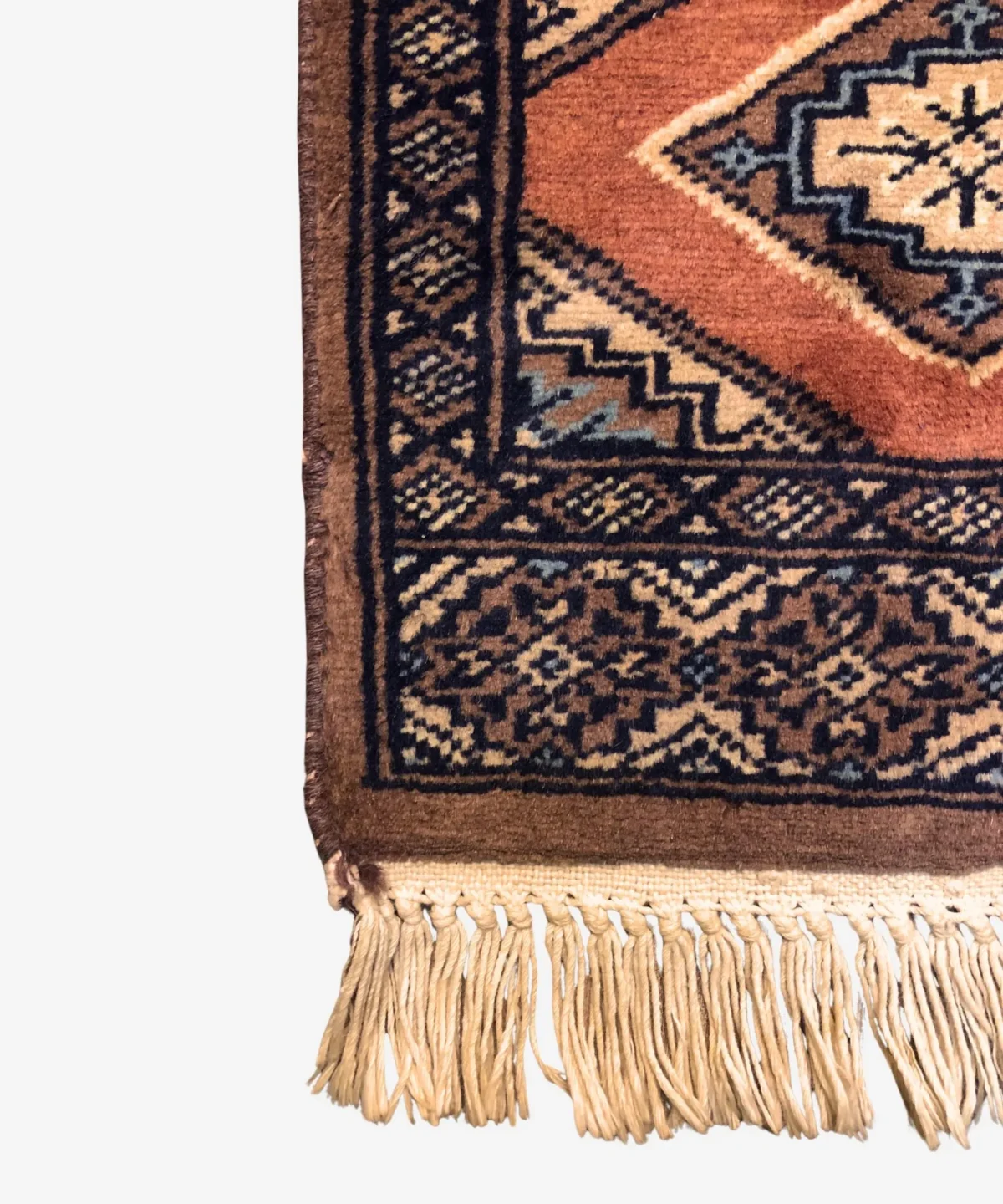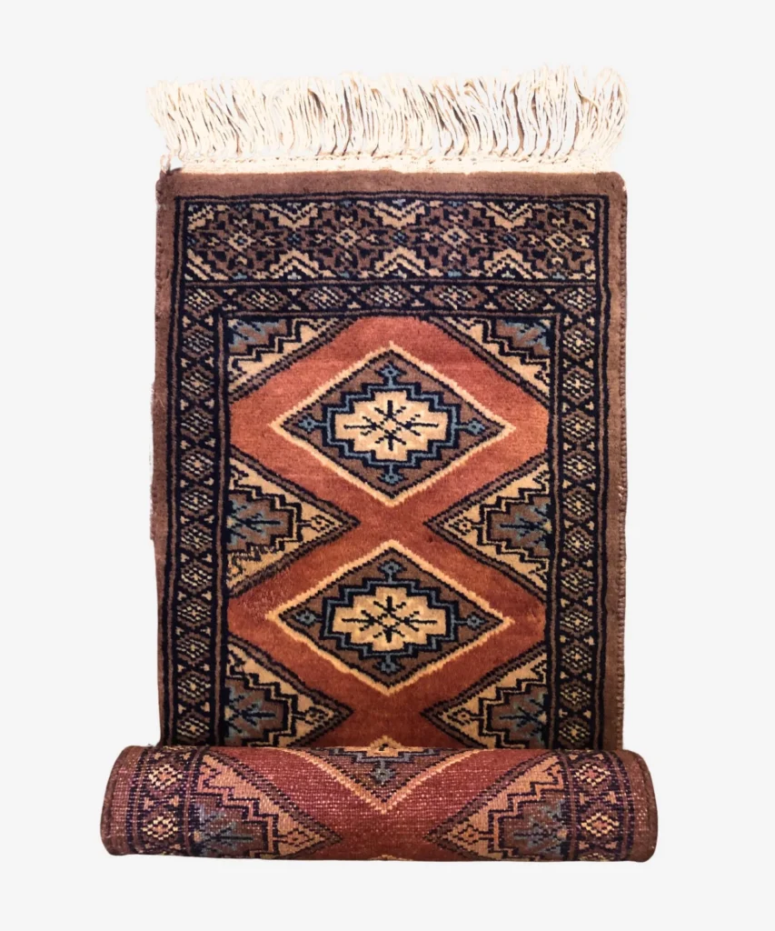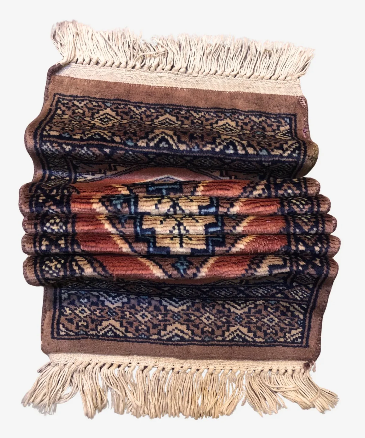 This rug is rare because handmade runners in such a slim size are not commonly produced. Its compact shape, bronze tone, and careful weaving make it a unique, versatile accent.