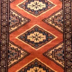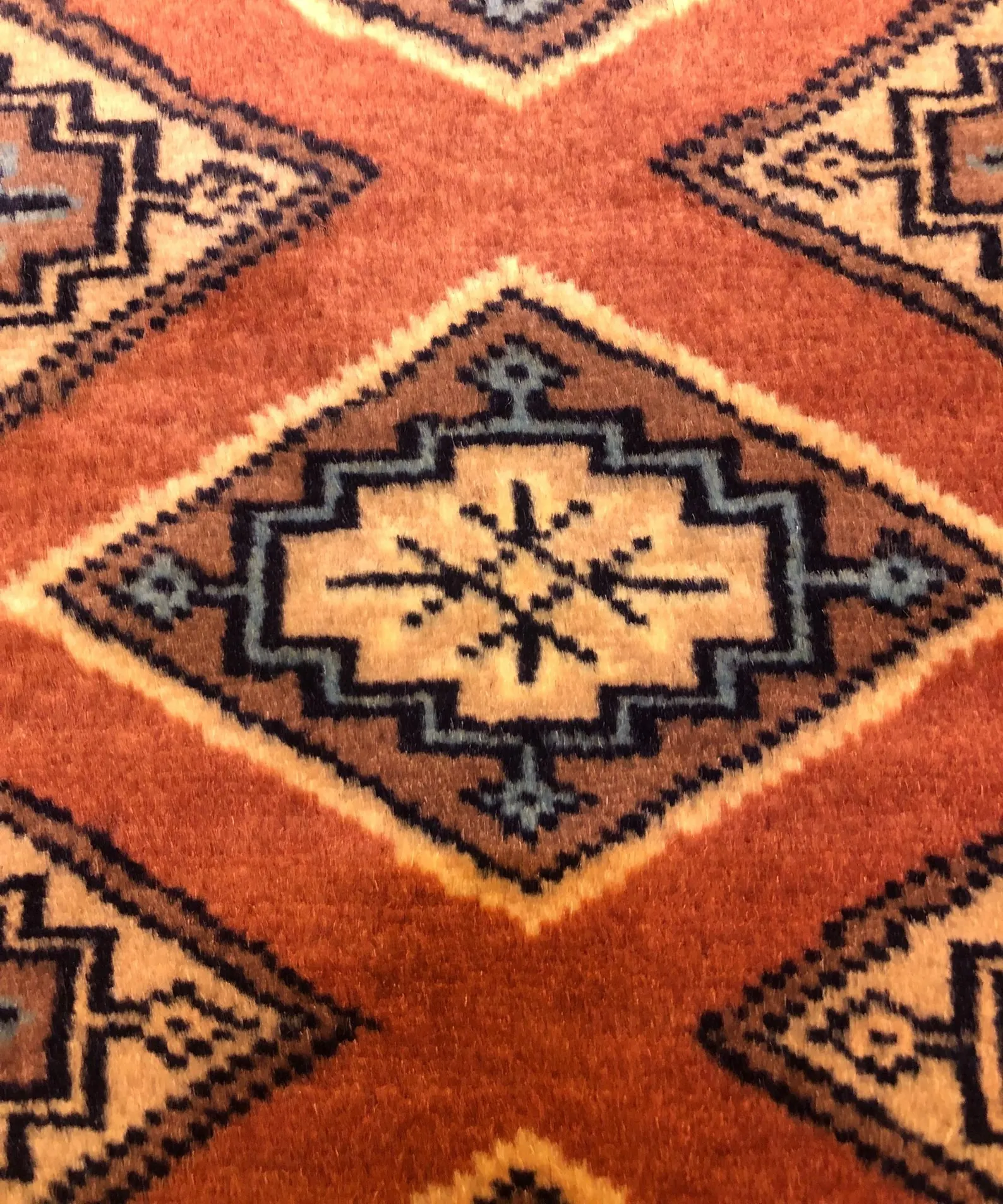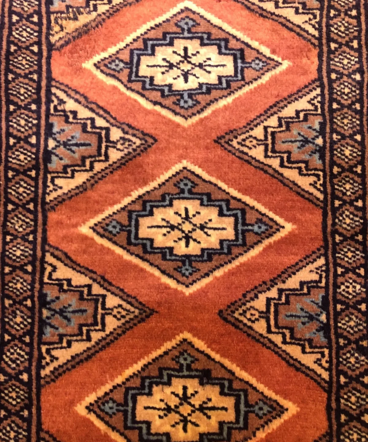 This is a hand-knotted runner rug from Pakistan with a bronze tone and simple geometrical design. It's long and slim, great for small spaces like entryways or beside furniture.
