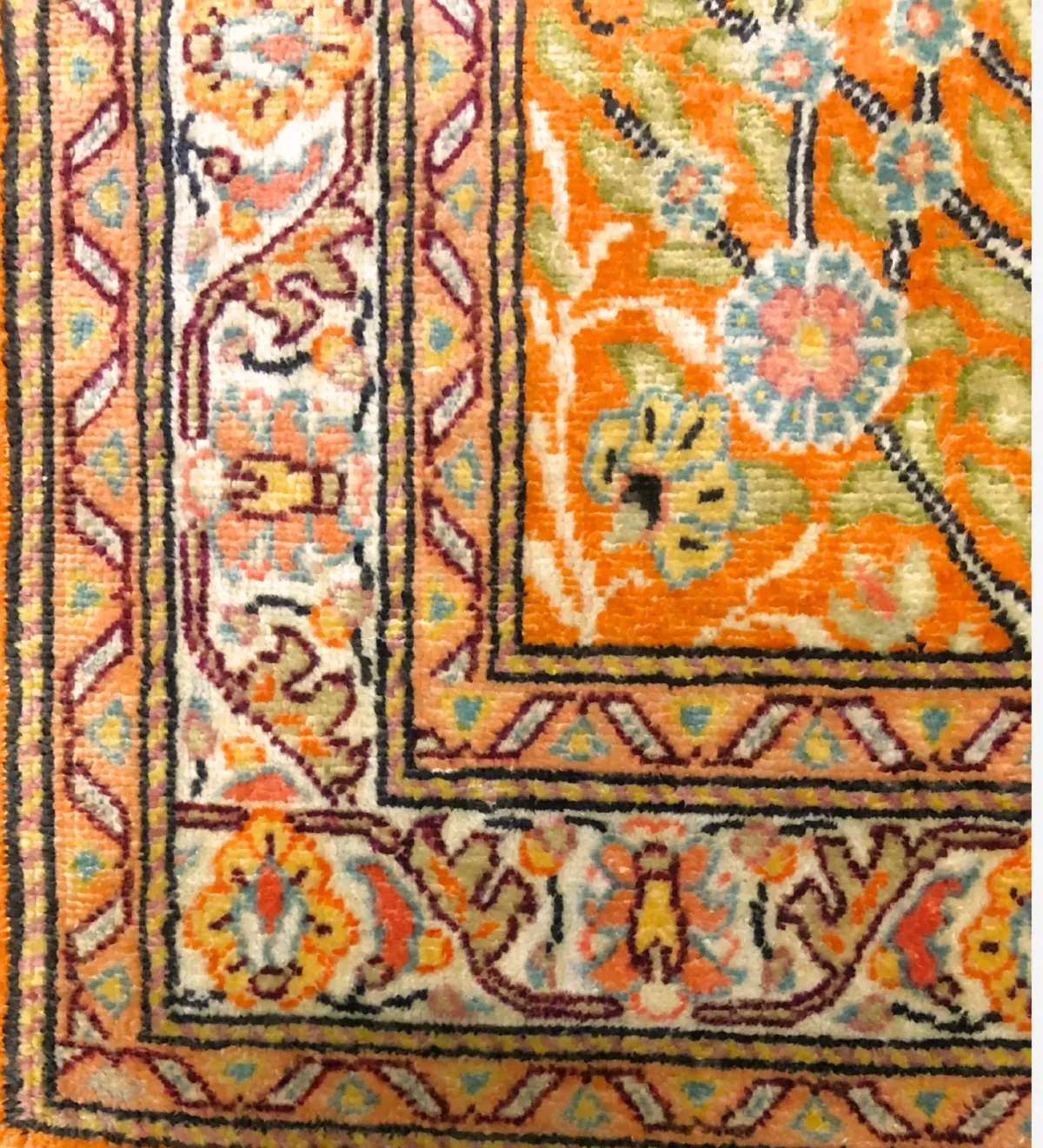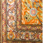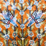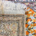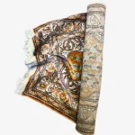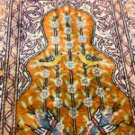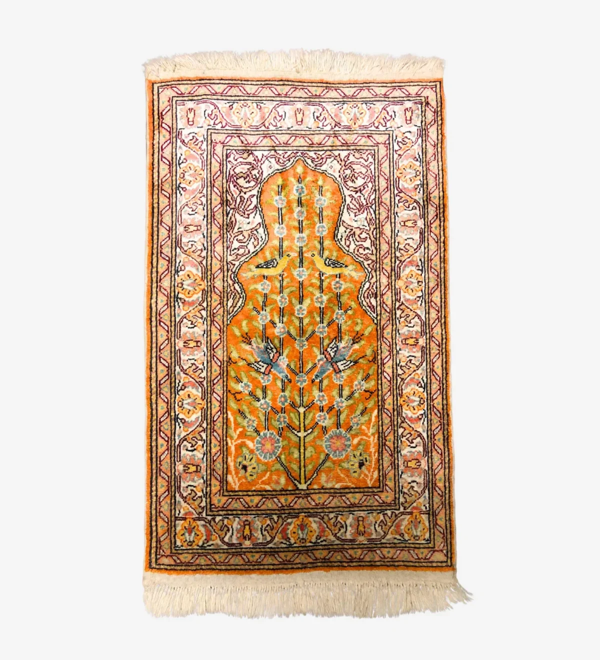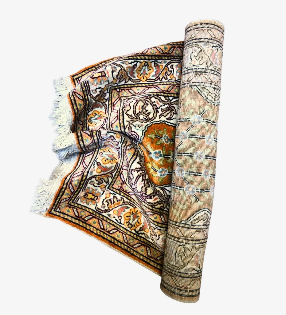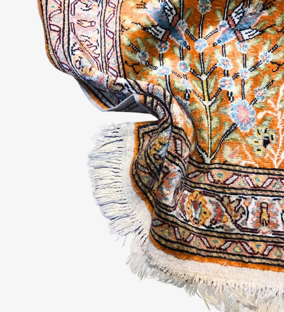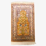 This is a beautiful handmade Turkish Kesari rug, about 60 x 90 cm (2 x 3 ft) in size. It’s made with soft silk on a cotton base, which gives it a light, smooth feel while keeping it strong.