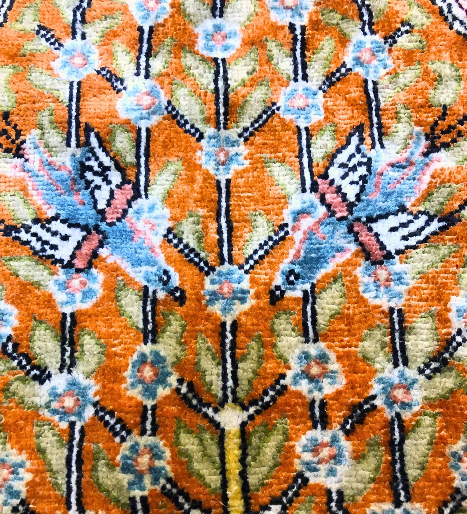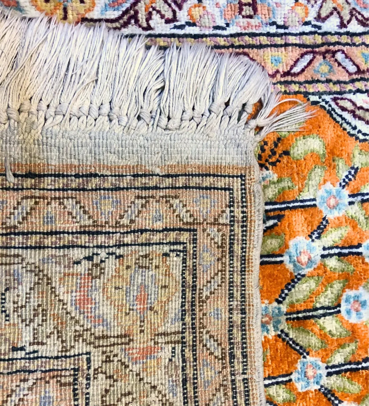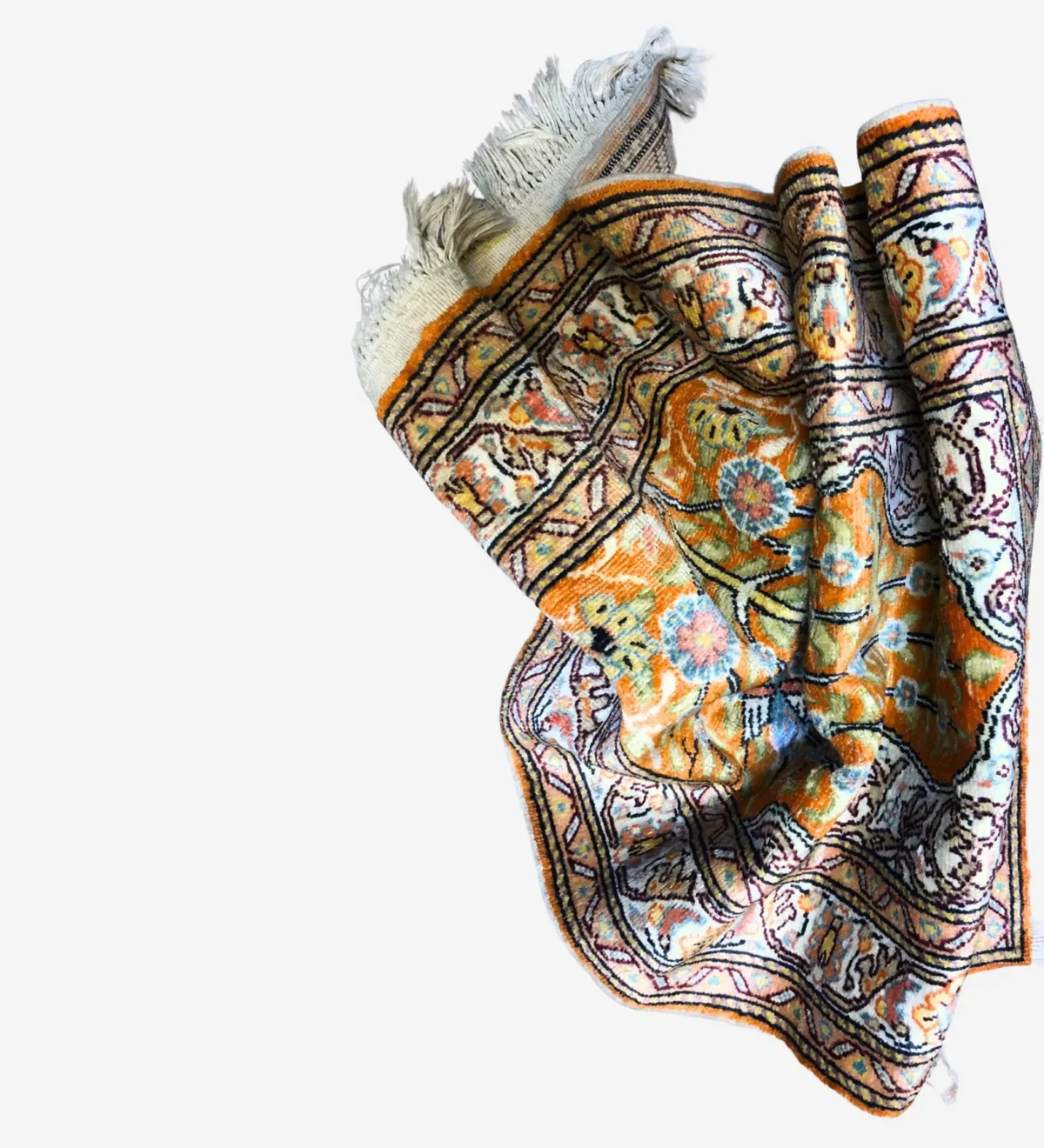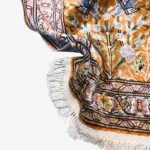 This is a beautiful handmade Turkish Kesari rug, about 60 x 90 cm (2 x 3 ft) in size. It’s made with soft silk on a cotton base, which gives it a light, smooth feel while keeping it strong.