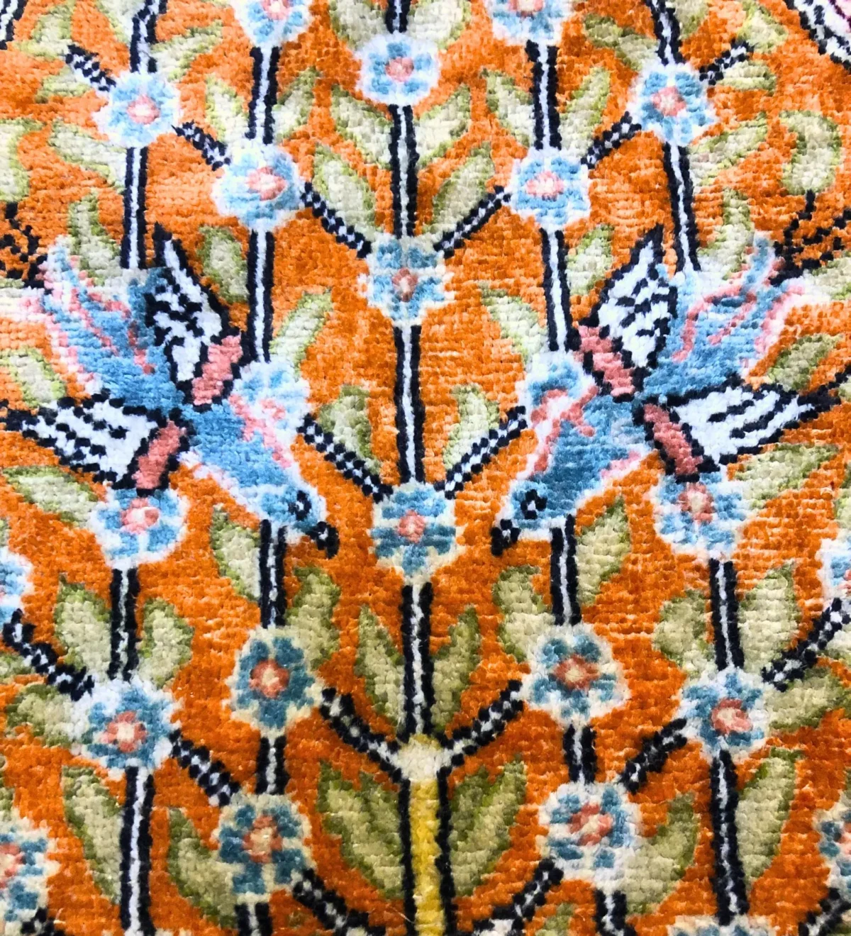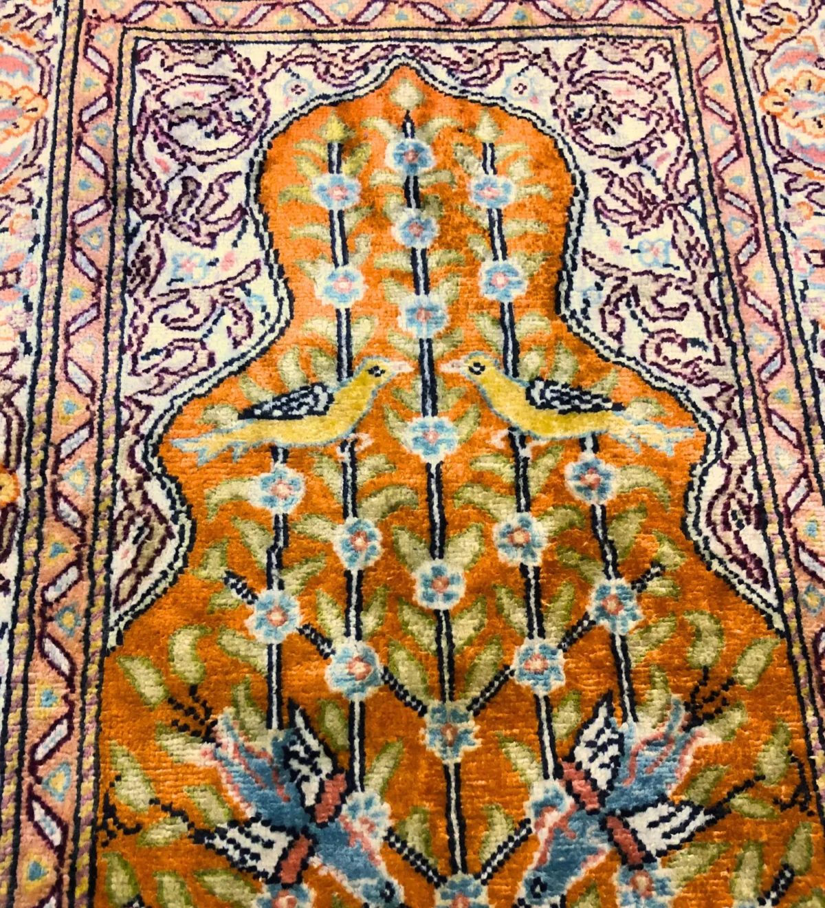 The orange color really stands out, and the bird and floral patterns are full of charm and detail. It has that old-world look that only antique rugs can have.