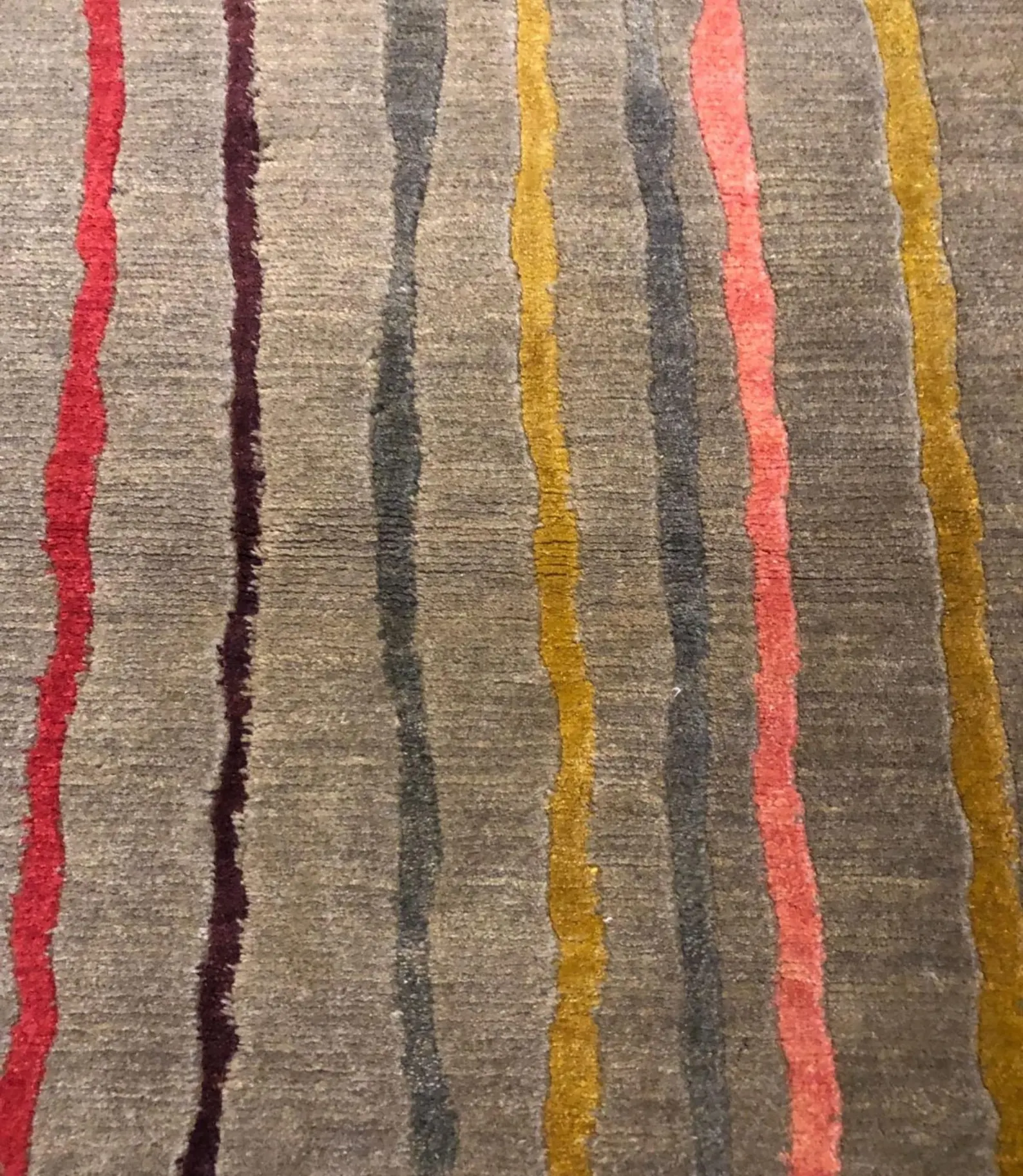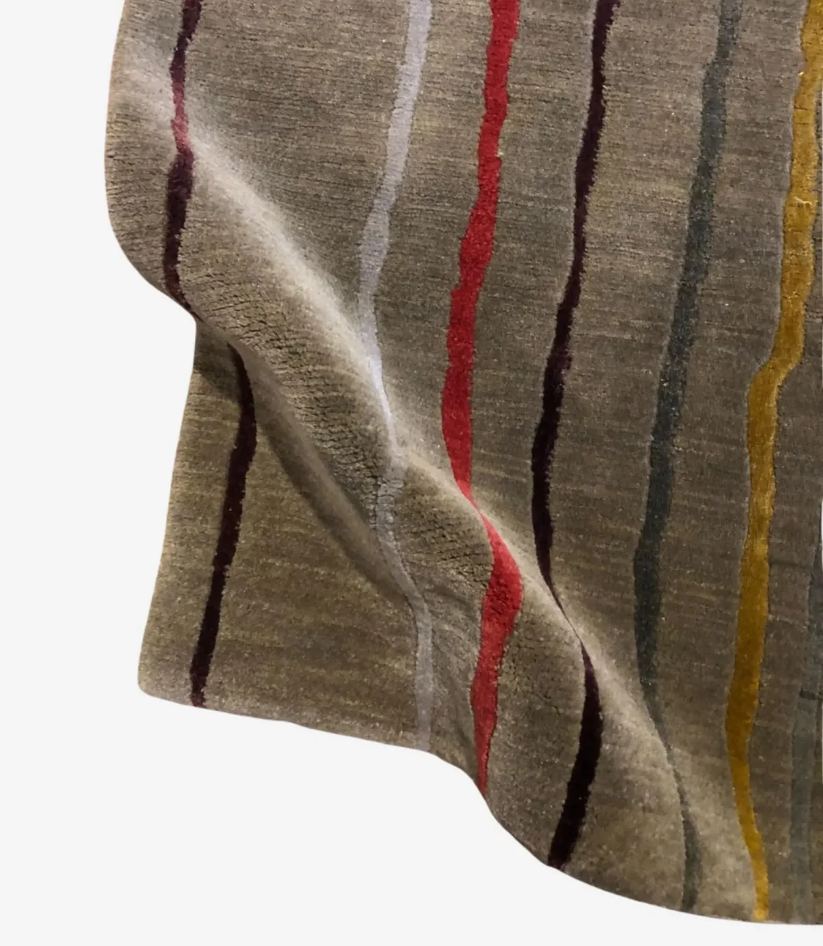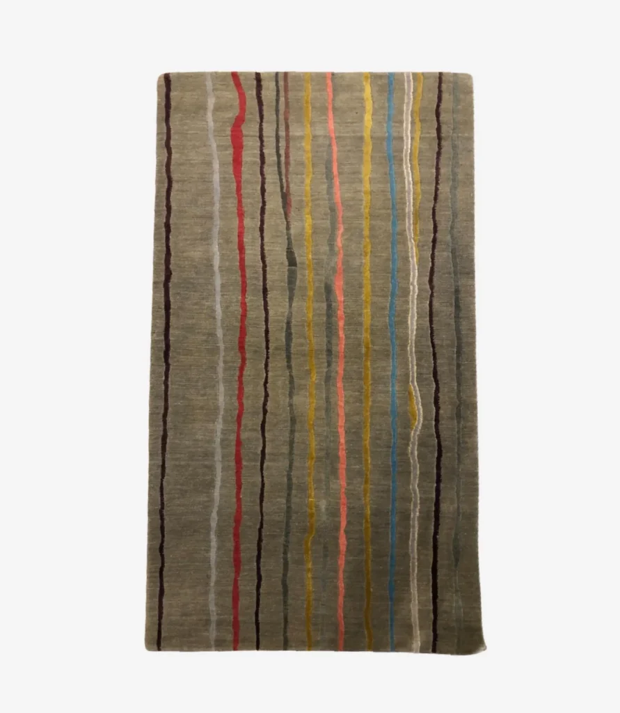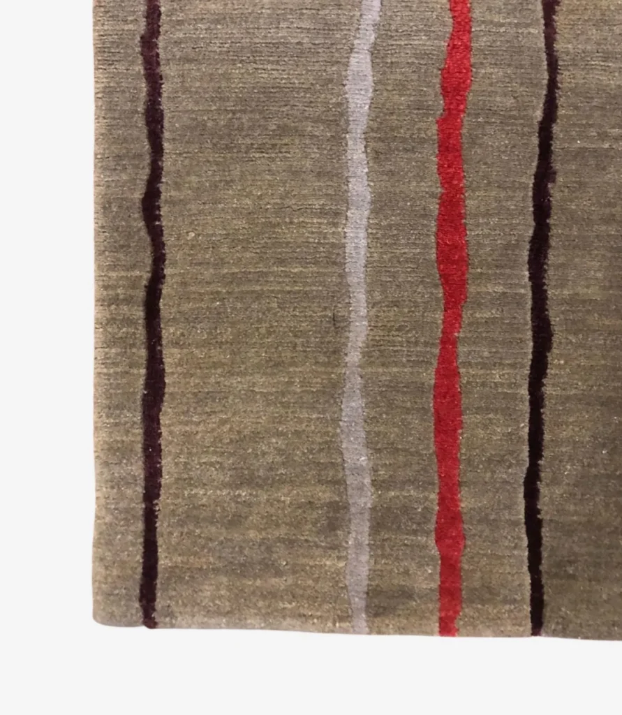 This rug is rare because it combines traditional hand-knotting with a modern striped design. Most hand-knotted rugs feature classic patterns, but this clean, simple style in soft wool is uncommon.
